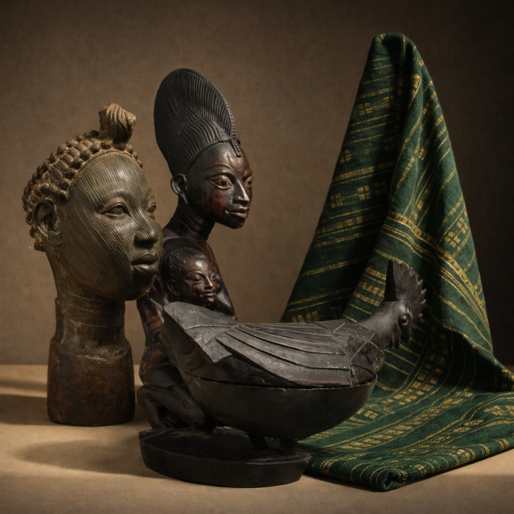 Sculpture, beadwork, the design of sacred crowns, Aṣọ-Oke and Àdìrẹ textiles, Bàtá and Dùndún music, masquerade, dance, and the visual symbolism woven through all Yoruba material culture.